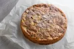 - 6 Tešlą pilti į formą (naudojau 24 cm skersmens, nusegamais kraštais, kepimo popieriumi iškloto dugnu), išlyginti paviršių. Formą pakelti kelis centimetrus nuo stalviršio ir švelniai stuktelėti dugną į stalviršį, kad išeitų oro burbuliukai.