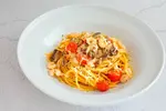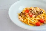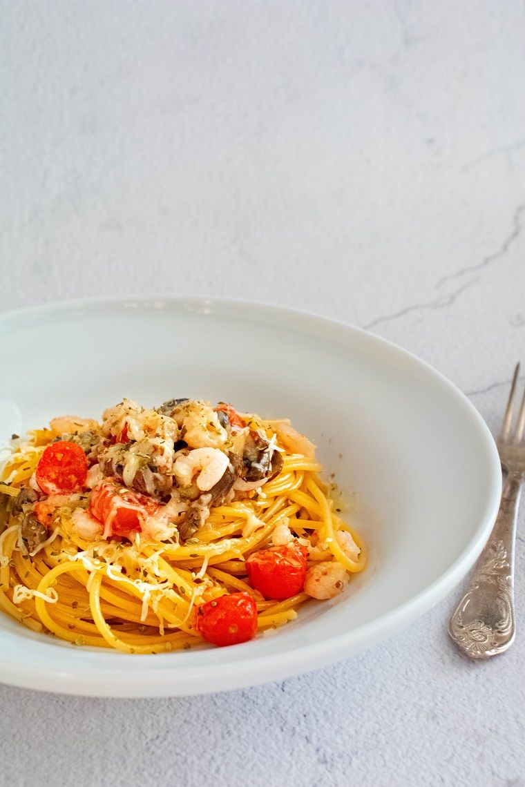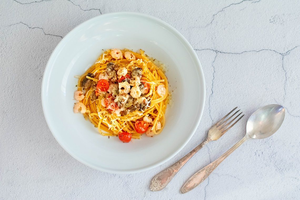 Makaronai su krevetėmis, pievagrybiais ir pomidorais