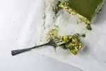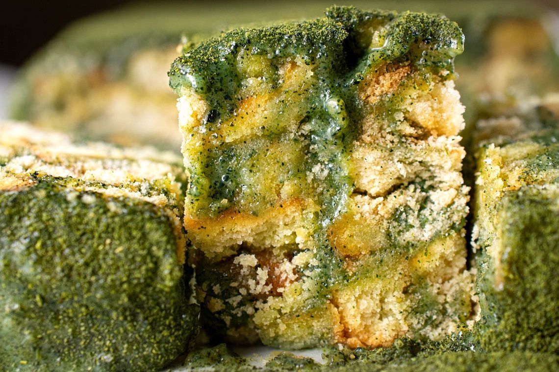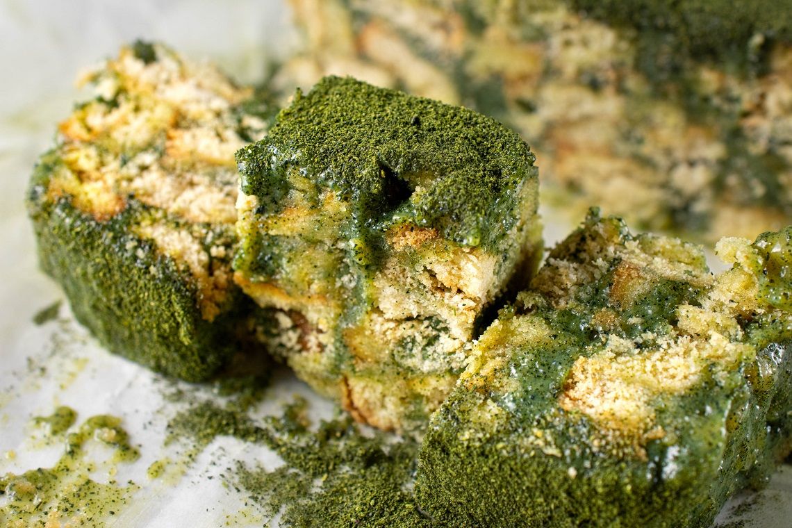 - 6 Tinginį bent kelioms valandoms (o geriau pernakt) dėti į šaldytuvą sustingi. Prieš pjaustant galima papildomai papuošimui pabarstyti Matcha milteliais.