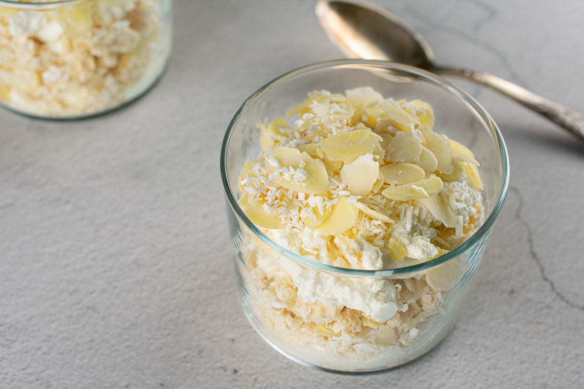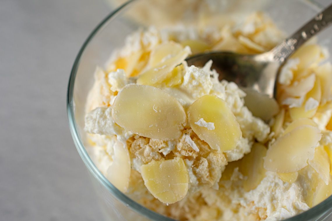 - 3Į stiklines sluoksniuoti varškę, vaflių mišinį, vėl varškė ir barstyti vaflių mišiniu. Papildomai galima viršų papuošti migdolų drožlėmis.