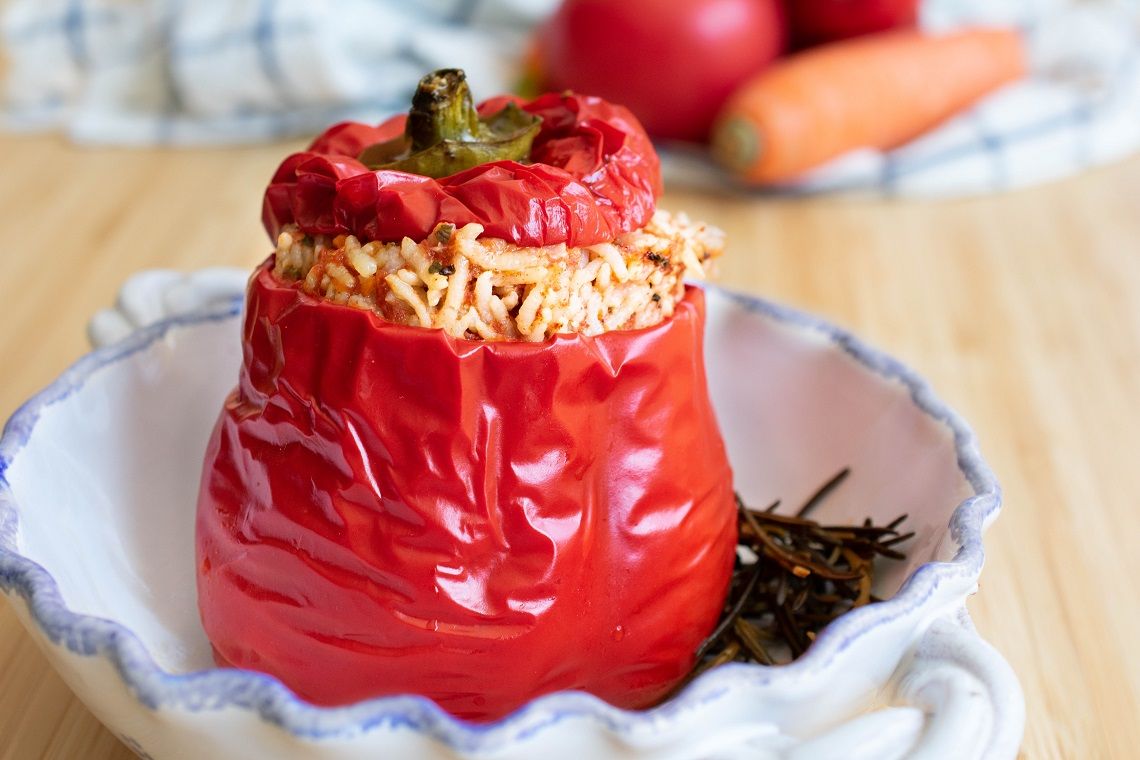 Ryžiais ir pomidorais įdarytos paprikos graikiškai Yemista