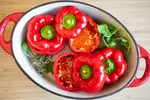 0/6- 1 Atsargiai nupjauti paprikų viršūnėles, išpjauti sėklas ir membranas.