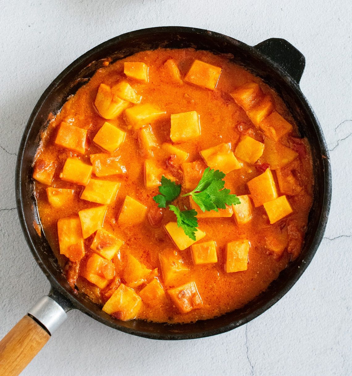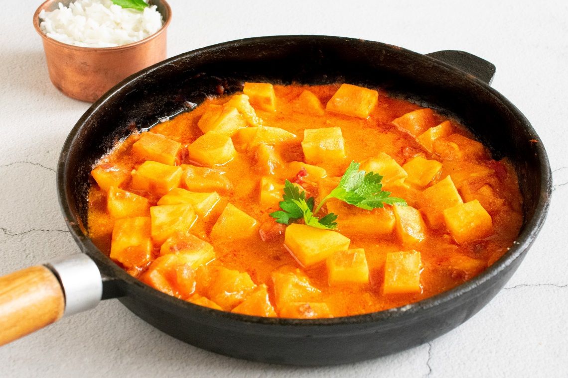 - 5 Patikrinti, ar bulvės suminkštėjo - turėtų lengvai, be pasipriešinimo įsmigti šakutė. Jei bulvės dar nepakankamai minkštos - troškinti ilgiau. Kai bulvės jau bus suminkštėjusios, pilti kokosų pieną, išmaišyti ir dar minutėlę patroškinti.