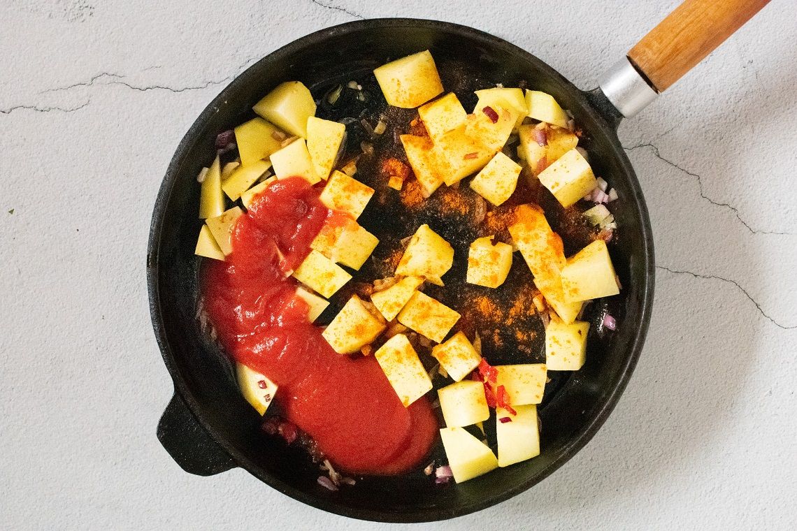 - 3 Pilti pomidorų tyrę (arba dėti smulkintus pomidorus) ir dar kelias minutes pakepinti.